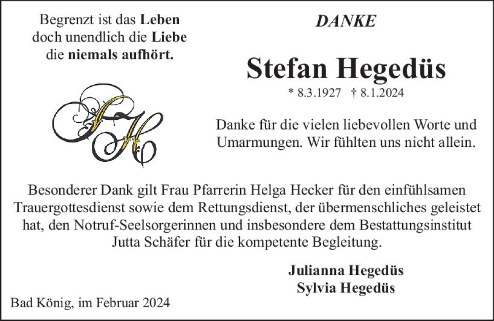 Hier finden Sie alle Traueranzeigen aus der Zeitung, die bisher für Stefan Hegedüs erschienen sind. Weitere Traueranzeigen, die in der Zeitung erscheinen, werden hier ebenfalls aufgelistet
