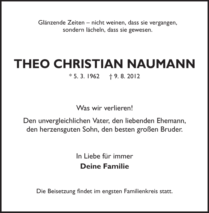 Hier finden Sie alle Traueranzeigen aus der Zeitung, die bisher für Theo Christian Naumann erschienen sind. Weitere Traueranzeigen, die in der Zeitung erscheinen, werden hier ebenfalls aufgelistet