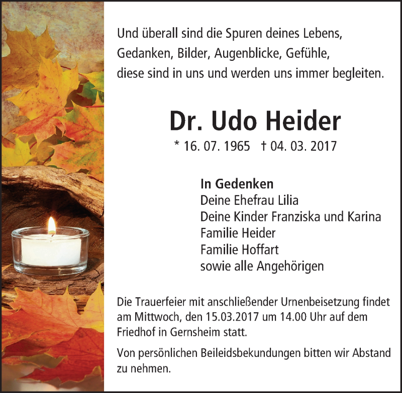 Hier finden Sie alle Traueranzeigen aus der Zeitung, die bisher für Udo Heider erschienen sind. Weitere Traueranzeigen, die in der Zeitung erscheinen, werden hier ebenfalls aufgelistet