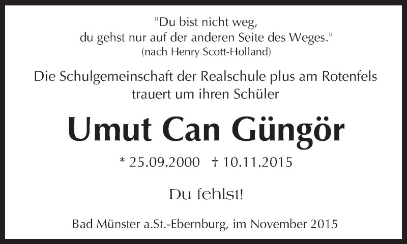 Hier finden Sie alle Traueranzeigen aus der Zeitung, die bisher für Umut Can Güngör erschienen sind. Weitere Traueranzeigen, die in der Zeitung erscheinen, werden hier ebenfalls aufgelistet