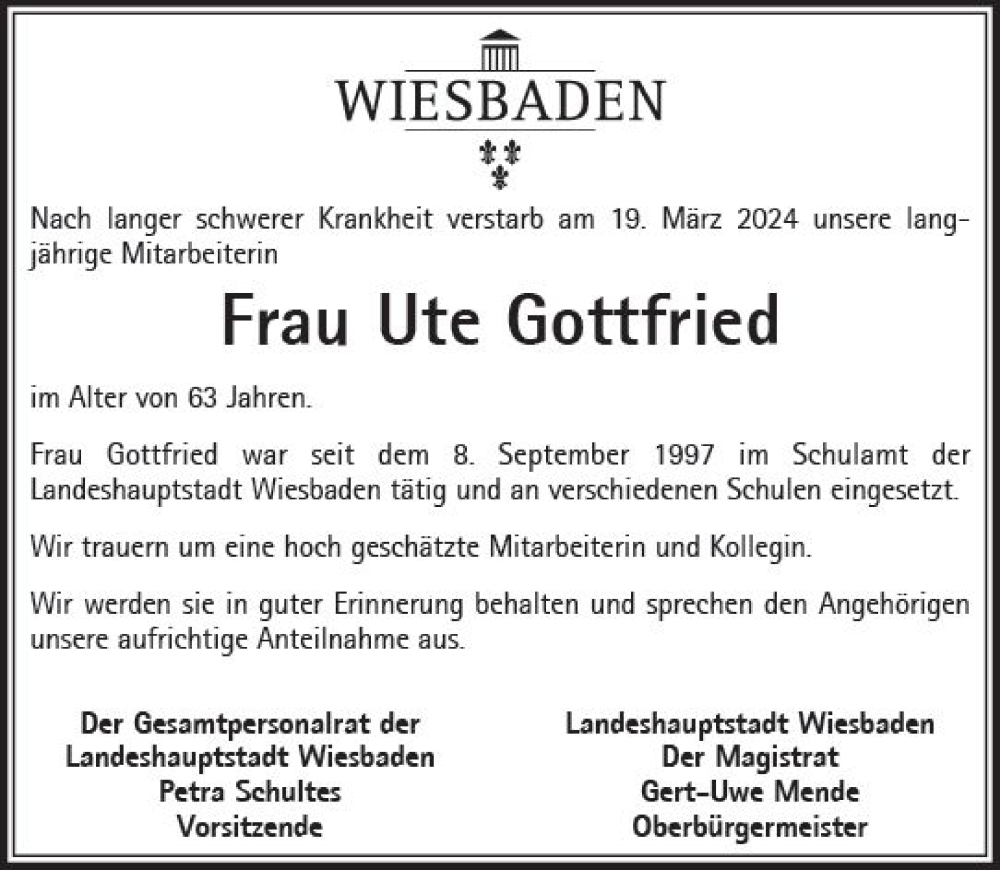 Hier finden Sie alle Traueranzeigen aus der Zeitung, die bisher für Ute Gottfried erschienen sind. Weitere Traueranzeigen, die in der Zeitung erscheinen, werden hier ebenfalls aufgelistet