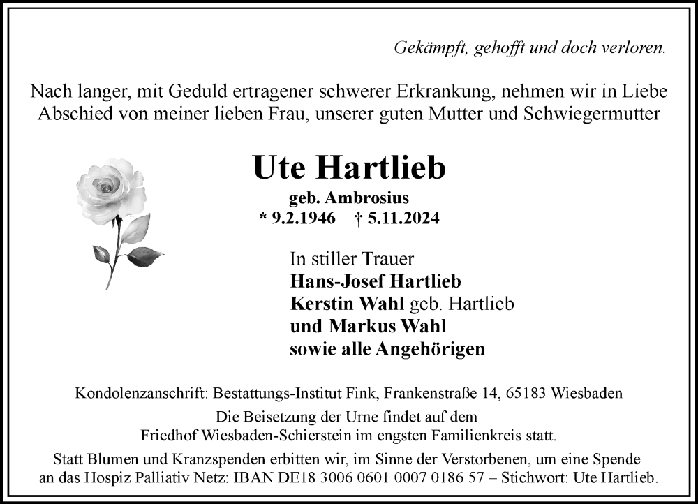 Hier finden Sie alle Traueranzeigen aus der Zeitung, die bisher für Ute Hartlieb erschienen sind. Weitere Traueranzeigen, die in der Zeitung erscheinen, werden hier ebenfalls aufgelistet