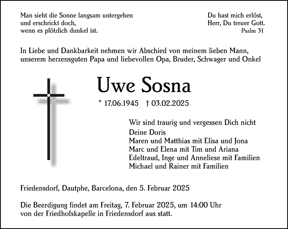 Hier finden Sie alle Traueranzeigen aus der Zeitung, die bisher für Uwe Sosna erschienen sind. Weitere Traueranzeigen, die in der Zeitung erscheinen, werden hier ebenfalls aufgelistet