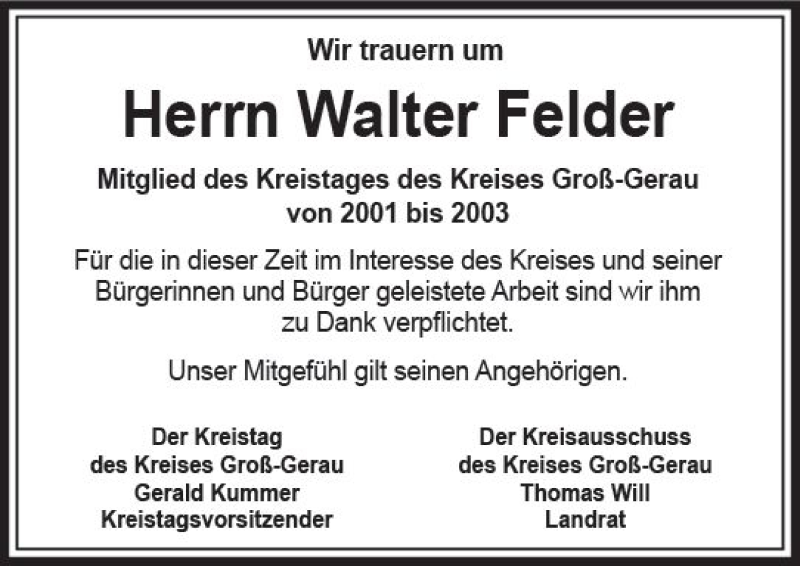 Hier finden Sie alle Traueranzeigen aus der Zeitung, die bisher für Walter Felder erschienen sind. Weitere Traueranzeigen, die in der Zeitung erscheinen, werden hier ebenfalls aufgelistet