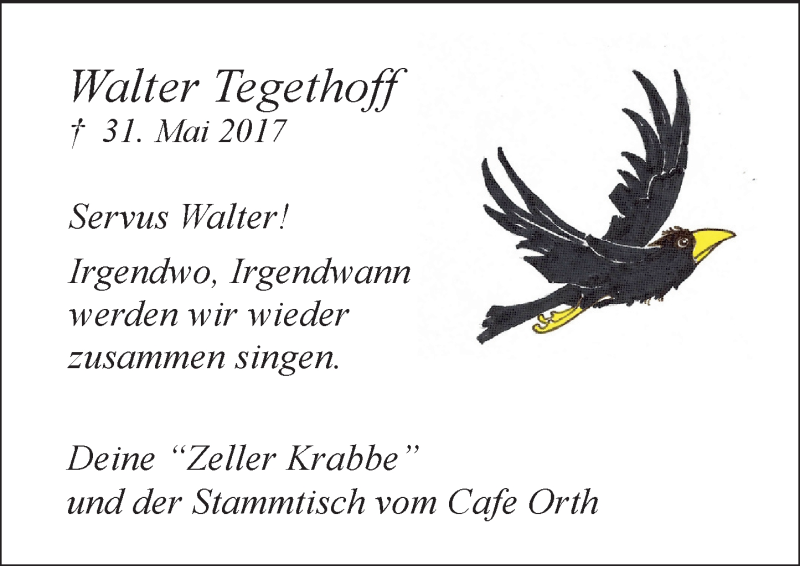 Hier finden Sie alle Traueranzeigen aus der Zeitung, die bisher für Walter Tegethoff erschienen sind. Weitere Traueranzeigen, die in der Zeitung erscheinen, werden hier ebenfalls aufgelistet