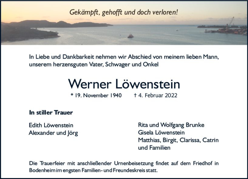 Hier finden Sie alle Traueranzeigen aus der Zeitung, die bisher für Werner Löwenstein erschienen sind. Weitere Traueranzeigen, die in der Zeitung erscheinen, werden hier ebenfalls aufgelistet
