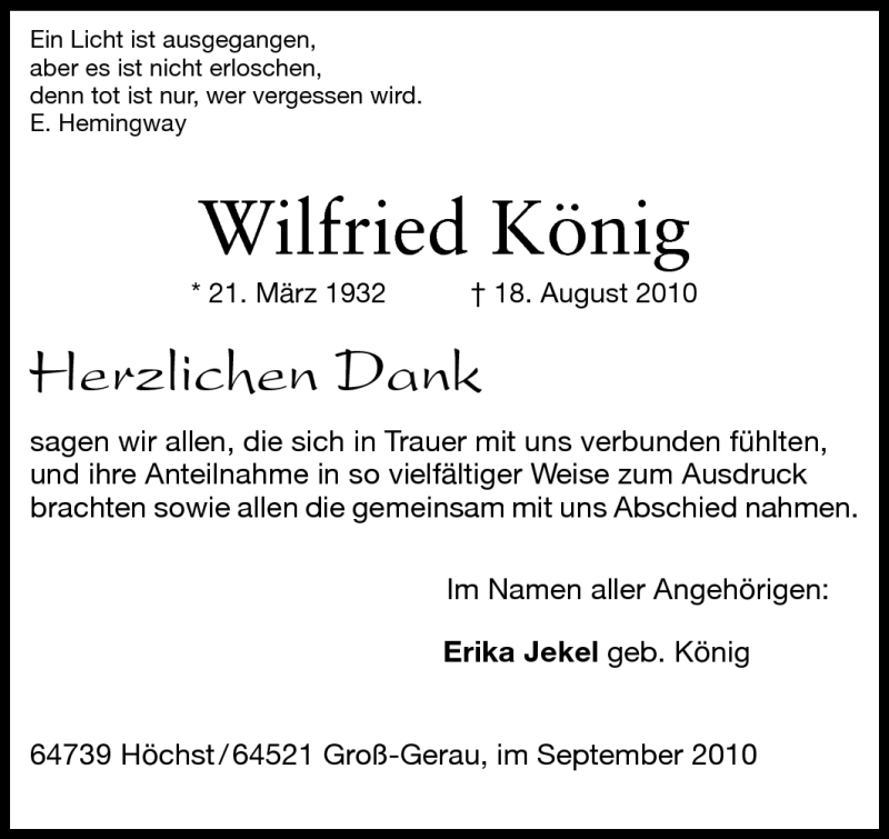 Hier finden Sie alle Traueranzeigen aus der Zeitung, die bisher für Wilfried König erschienen sind. Weitere Traueranzeigen, die in der Zeitung erscheinen, werden hier ebenfalls aufgelistet