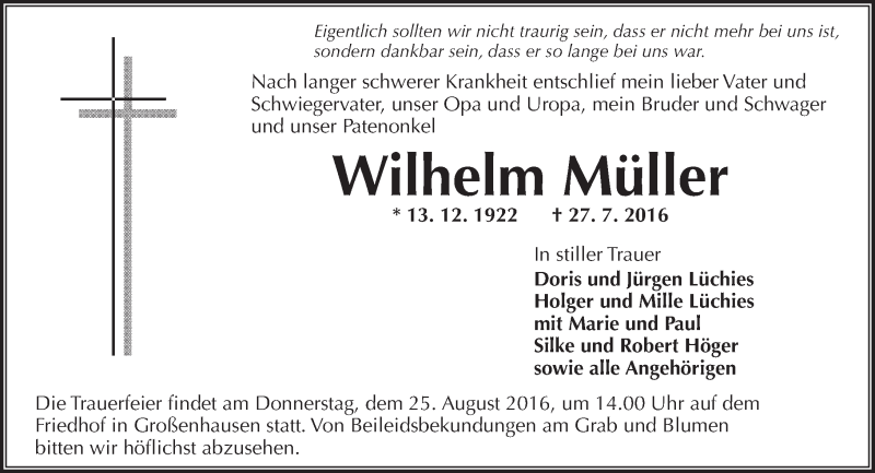 Hier finden Sie alle Traueranzeigen aus der Zeitung, die bisher für Wilhelm Müller erschienen sind. Weitere Traueranzeigen, die in der Zeitung erscheinen, werden hier ebenfalls aufgelistet