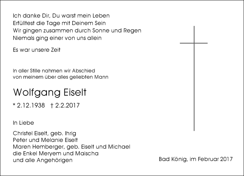 Hier finden Sie alle Traueranzeigen aus der Zeitung, die bisher für Wolfgang Eiselt erschienen sind. Weitere Traueranzeigen, die in der Zeitung erscheinen, werden hier ebenfalls aufgelistet