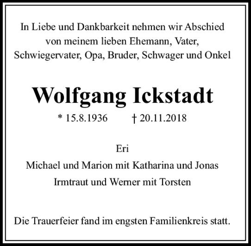 Hier finden Sie alle Traueranzeigen aus der Zeitung, die bisher für Wolfgang Ickstadt erschienen sind. Weitere Traueranzeigen, die in der Zeitung erscheinen, werden hier ebenfalls aufgelistet