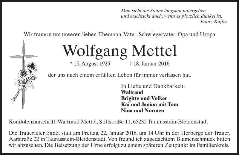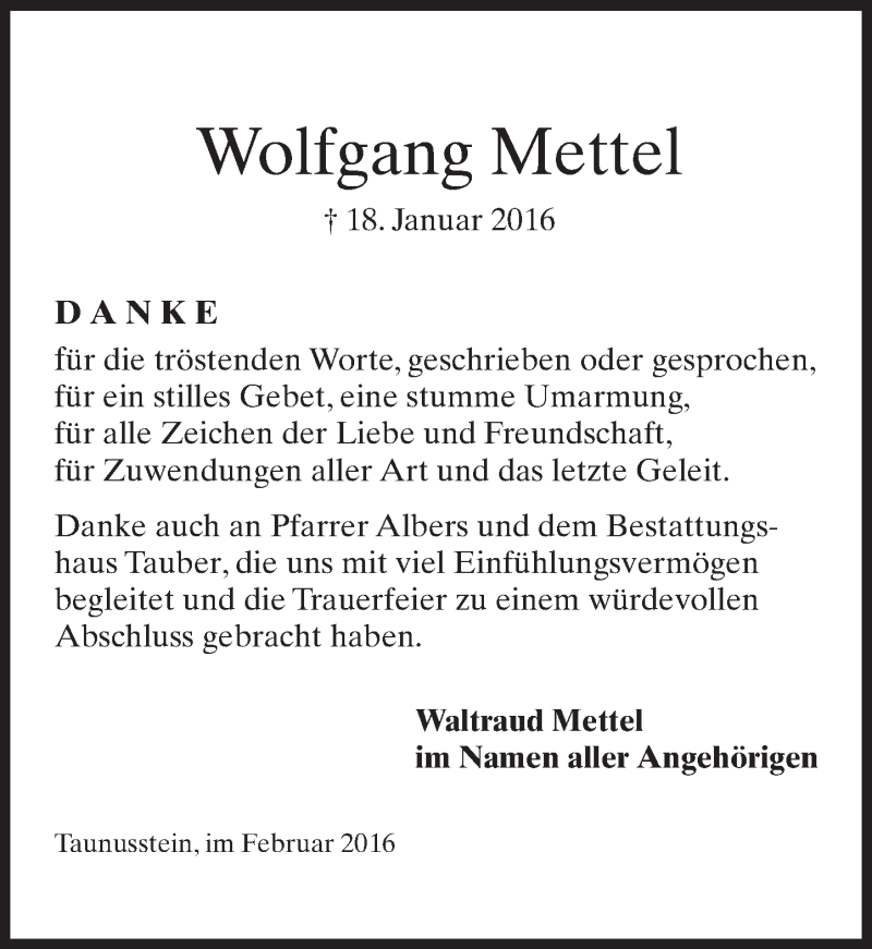 Hier finden Sie alle Traueranzeigen aus der Zeitung, die bisher für Wolfgang Mettel erschienen sind. Weitere Traueranzeigen, die in der Zeitung erscheinen, werden hier ebenfalls aufgelistet