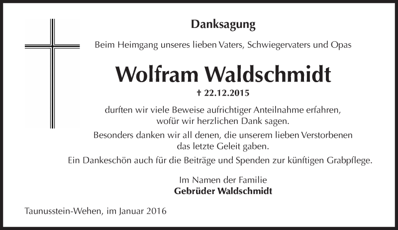 Hier finden Sie alle Traueranzeigen aus der Zeitung, die bisher für Wolfram Waldschmidt erschienen sind. Weitere Traueranzeigen, die in der Zeitung erscheinen, werden hier ebenfalls aufgelistet